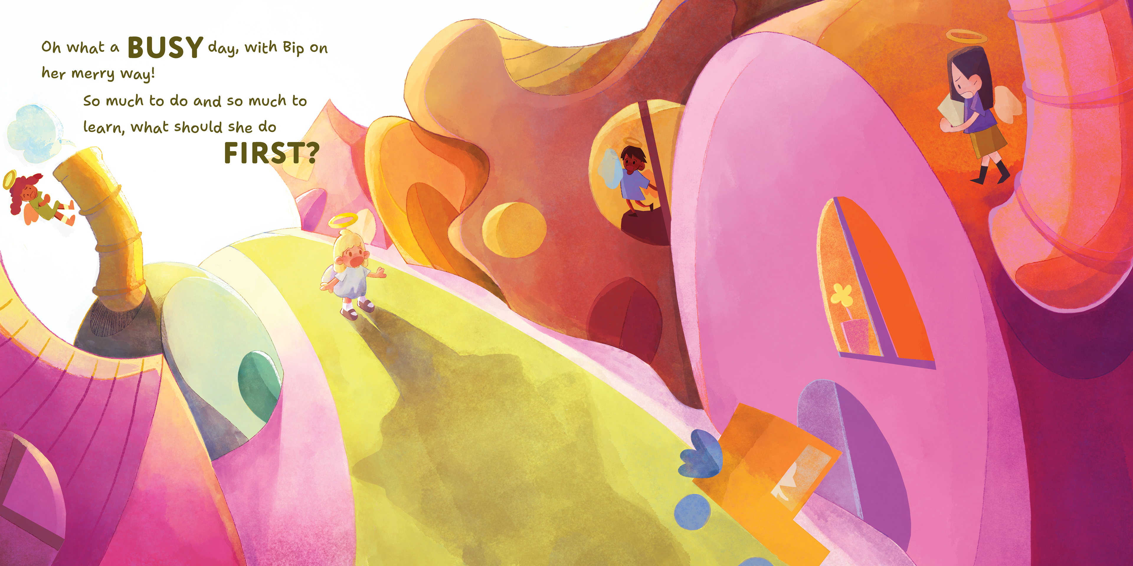 Children's Book exploration on BIP, an indecisive angel, who explores paths trying to find her passion.