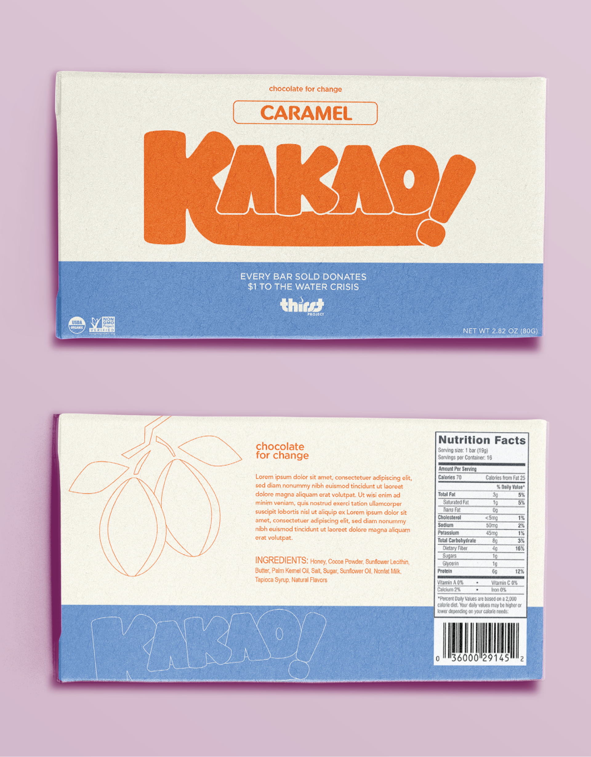 Chocolate production uses an enormous amount of water. Realizing this in relation to the number of people who do not have access to clean water, KAKAO will donate $1 to organizations that aid the water crisis such as Thirst Project for each chocolate bar they sell.