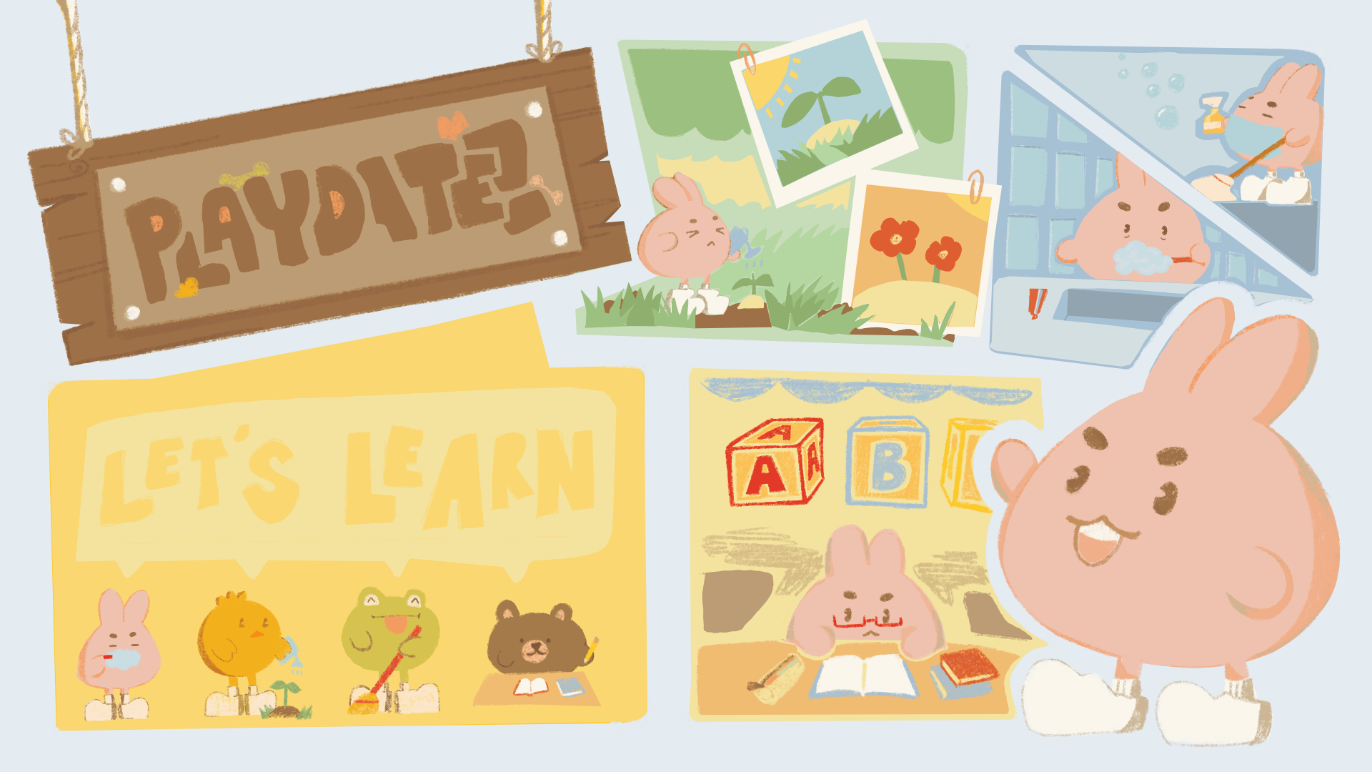 Promotion illustration for mock game "PLAYDATE", a game geared towards a younger audience to promote healthy habits through character simulation.